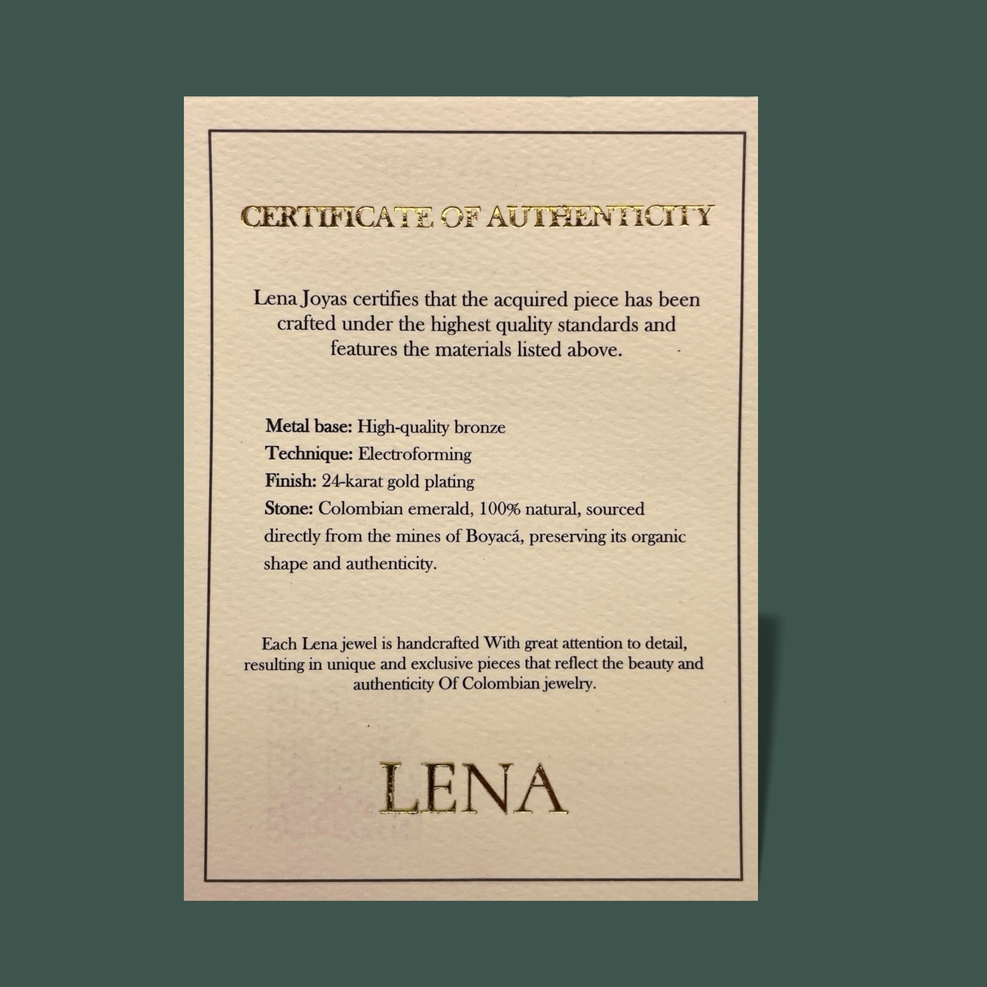 Ogni pezzo è unico e racconta la storia dell'artigianato latinoamericano di qualità. Gli smeraldi provengono dalla rinomata regione di Muzo, conosciuta in tutto il mondo per la qualità eccezionale delle sue pietre preziose.